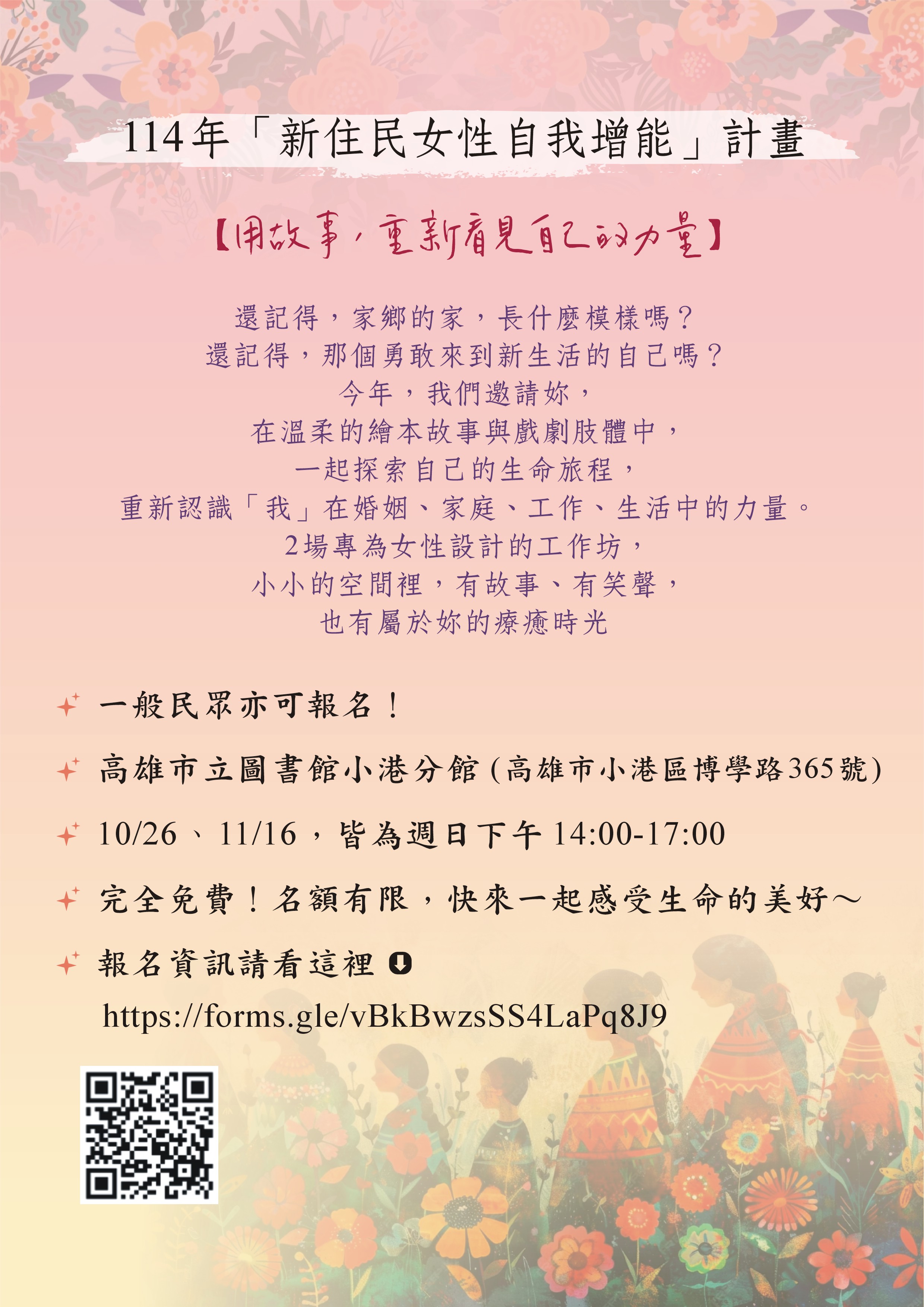 高雄市政府教育局家庭教育中心辦理「114年新住民女性自我增能計畫」,本計畫期望由生命歷程與性別觀點出發,並融入戲劇肢體課程,探討女性與婚姻、家庭、工作及生活等各面向應有之生活調適,提升女性包括自我肯定、家庭角色與家庭經營、生命覺察等。